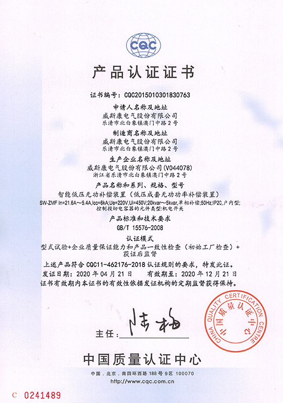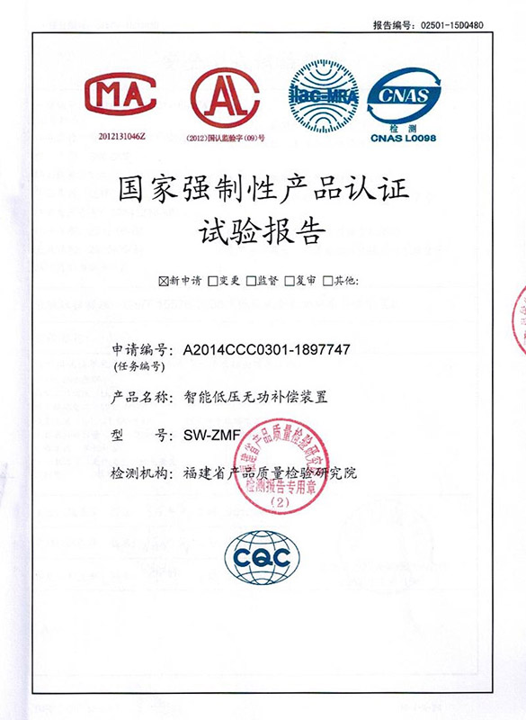 SW-ZMF智能低压无功补偿装置产品认证证书