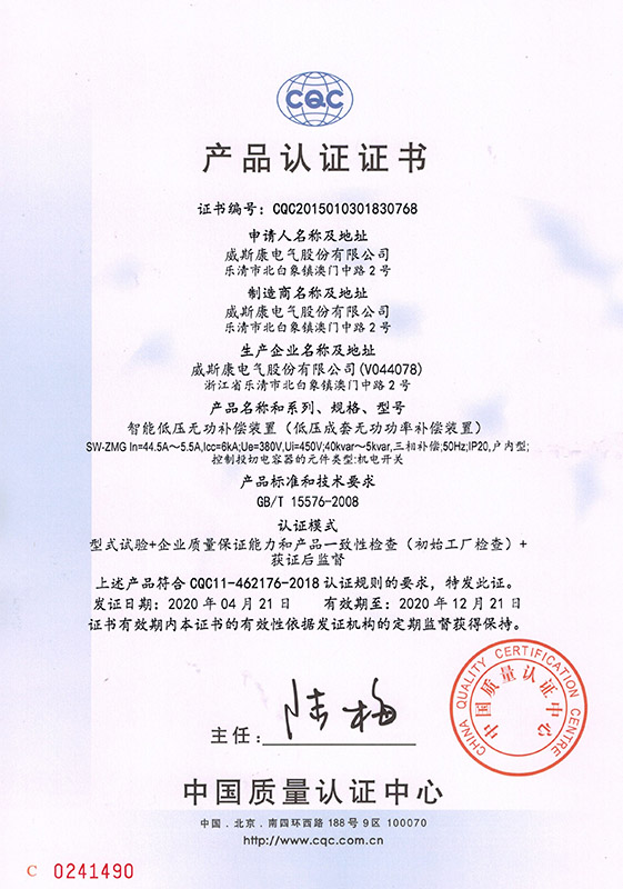 SW-ZMG智能低压无功补偿装置产品认证证书