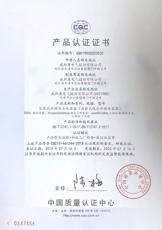 BKMJ自愈式并联电力电容器产品认证证书