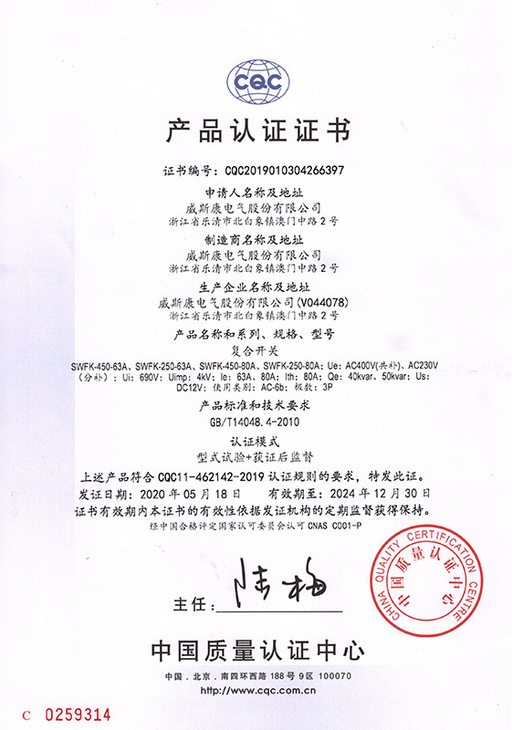 SWFK复合开关产品认证证书
