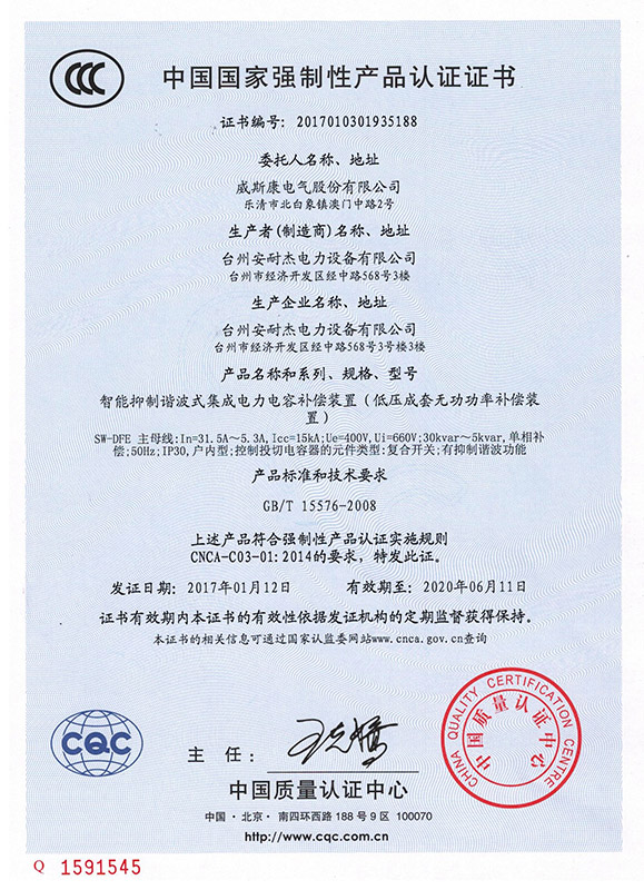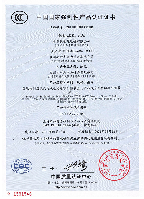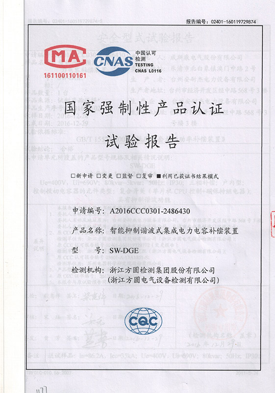 SW-DGE智能抑制谐波式集成电力电容补偿装置产品认证证书