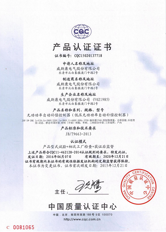 JKW无功补偿控制器产品认证证书