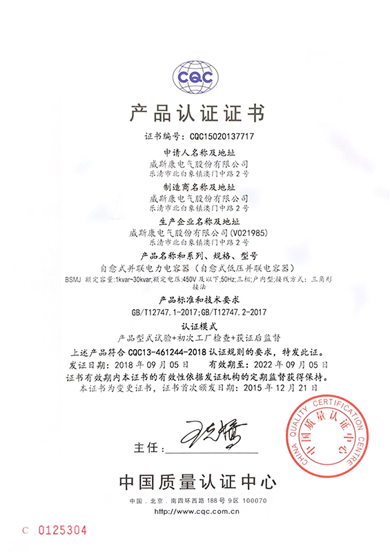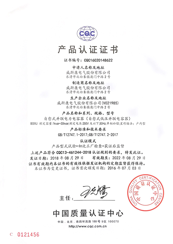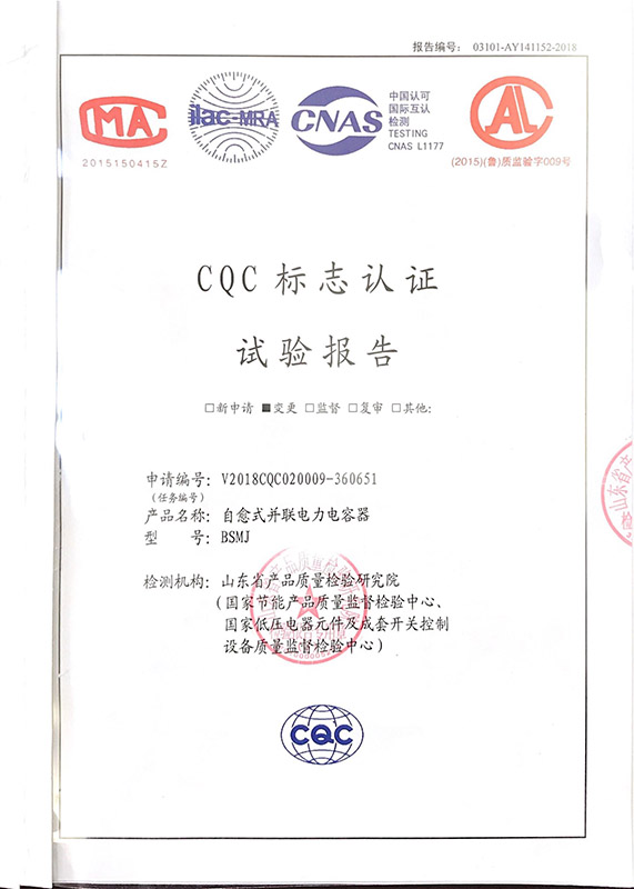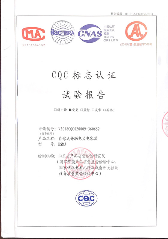 BSMJ自愈式并联电力电容器产品认证证书