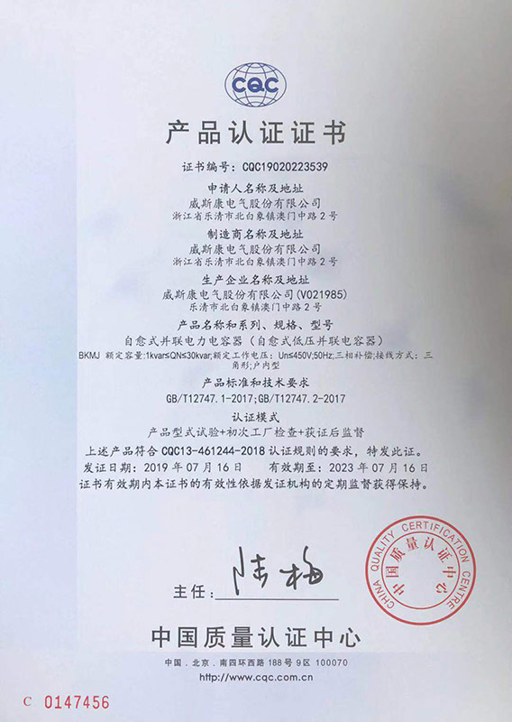 BKMJ自愈式并联电力电容器产品认证证书